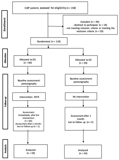Study flowchart [34]. CLBP—chronic low back pain; EG—experimental group; CG—control group; MFR—myofascial release.