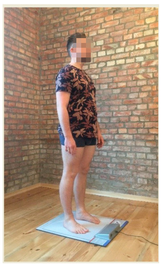 Postural stability was evaluated using a posturography test that registers and analyzes COP movement. The researchers registered and assessed stabilometric parameters using a Loran Engineering E.P.S./R1 stabilometric platform equipped with 2304 resistive sensors and Biomech Studio 2013 software. The assessment of postural stability was carried out in static conditions on a stable surface and in a free-standing position. Two tests were conducted—with eyes open (EO) and with eyes closed (EC). Each test was conducted in accordance with recommendations in the available literature and lasted 30 seconds [35]. Study participants were instructed to remain silent and stand freely while avoiding any movement of the body. Moreover, study participants could not see COP displacements on the screen, because, according to the observations of Wulf et al., watching COP displacements may lead to improved measurement results [36]. During the test with eyes opened the subjects were asked to focus their sight on a point at eye level at a distance of two meters. The participants stood on the platform on both feet, barefoot, with feet equally leveled to the hips and arms free alongside the body (Figure 2).