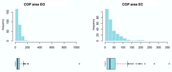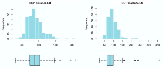 Box plots and histograms for the two-dimensional COP distance variable. The graphs were constructed from all the data gathered from both groups. COP—center of pressure; EO—eyes open; EC—eyes closed.