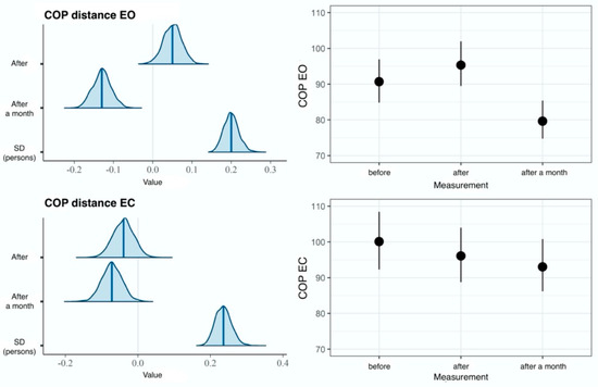 Results of hierarchical two-dimensional regression analysis: the dependent variable is the COP distance, and the main effect is the measurement in the experimental group. Left panels: a posteriori distributions of regression coefficients. Shaded areas denote 95% confidence level. Right panels: estimated marginal means. The points denote a posteriori distribution mean values, and vertical lines represent 95% confidence intervals. COP—center of pressure; EO—eyes open; EC—eyes closed.