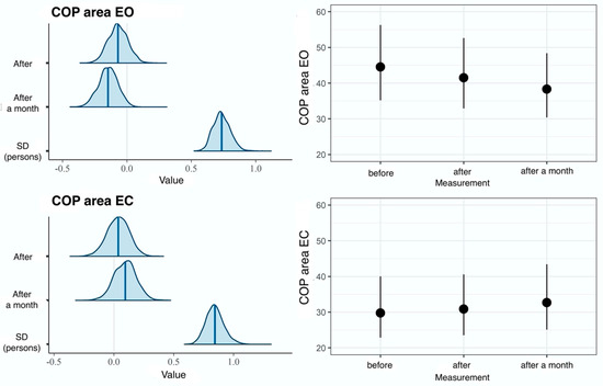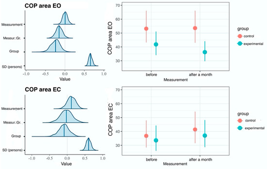Results of hierarchical two-dimensional regression analysis: the dependent variable is the COP-SA, and the main effect is the measurement in the experimental group. Left panels: a posteriori distributions of regression coefficients. Shaded areas denote 95% confidence level. Right panels: estimated marginal means. The points denote a posteriori distribution mean values, and vertical lines represent 95% confidence intervals. COP—center of pressure; EO—eyes open; EC—eyes closed.