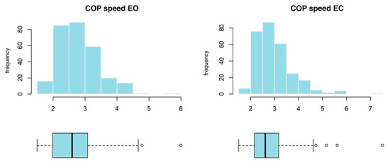 Box plots and histograms for the two-dimensional COP sway velocity variable. The graphs were constructed from all the data gathered from both groups. COP—center of pressure; EO—eyes open; EC—eyes closed.