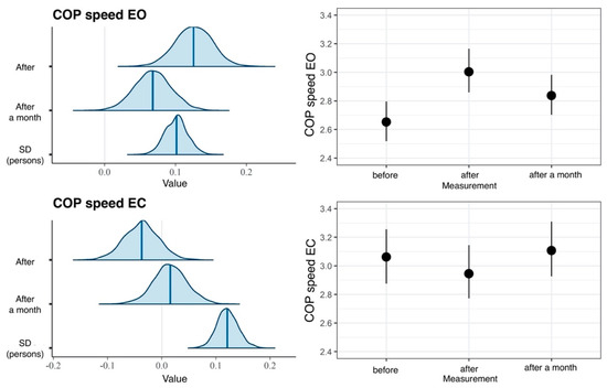 In comparisons made in the EG, the measurement model fits the data better than the null model, which is confirmed by the LOOIC difference of −9. Furthermore, the effect of time measurement accounted for 7% of the variance of the EO dimension and for merely 1% of the variance of the EC variable (Table 1). These results suggest a lack of effect on the EC dimension. The COP sway velocity value for the EO dimension was reliably higher both immediately after the intervention and one month following the treatment than before the intervention (Figure 10).