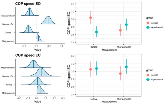 In comparisons of results between groups, the model with the interaction effect fits better the data better than the main effects model, which is confirmed by the LOOIC difference of −7, or the null model, which is confirmed by the LOOIC difference of −3. Main effects, interaction time and groups accounted for 6% of EO variance and 2% of EC variance (Table 1). We observed a difference in COP sway velocity values in the study groups before the intervention—the COP sway velocity was greater in the CG than in the EG (Figure 11); however, the difference vanished one month after the intervention.