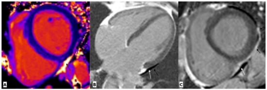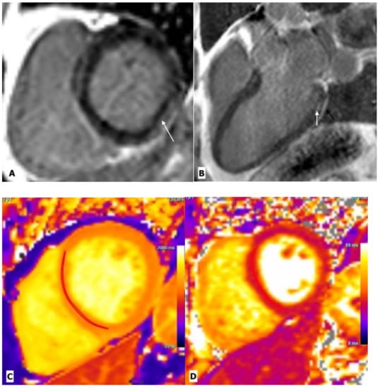 TTE is a useful tool in the diagnostic assessment of suspected myocarditis. TTE investigates the wall thickness, chamber volume, and systolic and diastolic dysfunctions, and thus does not provide any direct evidence of myocarditis [19] (Table 1). CMR is a promising tool for assessing myocardial inflammation. Comprehensive CMR imaging not only yields anatomic and functional cardiac information, but also provides information on myocardial tissue composition, including the degree of oedema, inflammation, and fibrosis (Figure 2). Several cardiac imaging studies have provided deep insight into the structural and functional alterations associated with HIV-related myocarditis. CMR parameters indicating myocardial inflammation are elevated in HIV-infected patients, even with subclinical diseases [20,21]. Myocardial functional alteration (systolic or diastolic dysfunctions) may be a result of this higher inflammatory burden [20]. Julian et al. evaluated cardiovascular involvement in asymptomatic HIV-infected patients using CMR. When compared with healthy controls, HIV-infected patients showed a reduced left ventricular ejection fraction and lower global peak strain values. CMR parameters of myocardial inflammation such as the native T1 and relative T2 signal intensity ratios were elevated in HIV-infected patients. Late gadolinium enhancement suggesting focal myocardial fibrosis was seen in midventricular and basal inferolateral subepicardial regions in 27.3% of healthy controls [20]. Ntobeko et al. conducted a similar study using CMR to detect subclinical inflammation and myocardial disease in asymptomatic HIV-infected individuals. Compared to healthy controls, HIV-infected patients showed elevated myocardial mass, reduced left ventricular ejection fraction, a lower peak diastolic strain rate, and higher native T1 values. Furthermore, myocardial fibrosis and pericardial effusions were common in HIV-infected subjects [21]. Both these studies indicate that CMR markers of myocarditis are elevated even in subclinical inflammation; therefore, CMR may reveal a high burden of cardiovascular disease in asymptomatic HIV-infected patients.