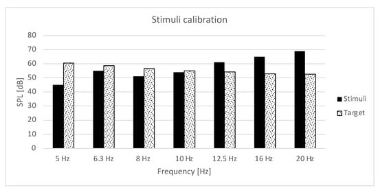 Figure 2. The proper match of levels was achieved for the 10 Hz band only. For 8 Hz, the level of stimuli was around 6 dB lower, for 6.3 Hz it was around 3 dB, and for 5 Hz it was significantly lower than the target level. For these very low frequencies, the subwoofers could not produce enough energy and any more equalization caused audible harmonic distortion and an even more prominent rise of levels in 10–20 Hz frequency bands. Any further cuts in the bands over 10 Hz caused dumping of the lower frequencies. The overall L