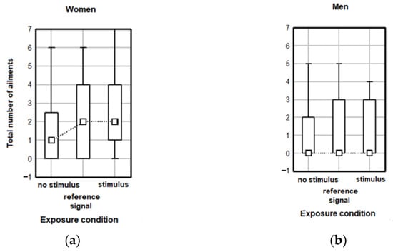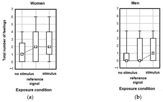 The gender-related analysis was also performed for the total number of feelings and the total number of ailments in relation to exposure conditions. The results show no significant effect of exposure conditions for females (Kruskal–Wallis test H(2, N = 74) = 3.91