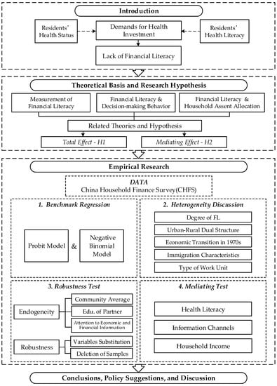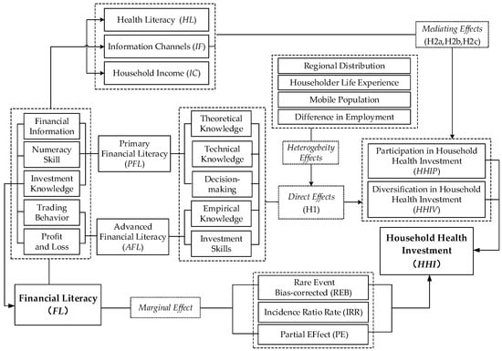 Health literacy is among the main drivers for households to engage in health investments [] (Figure 2). It is not only people’s perception of health but also the health care knowledge and life philosophy needed to maintain their health. First, existing studies point to the adverse effects of cognitive limitations and irrational stimuli on individual health behaviors. Financial literacy as a decision-making tool is associated with higher levels of education and rational decision making. Specifically, households with higher levels of financial literacy have a higher level of cognitive ability and acceptance of health issues and health knowledge. They will have more accurate disease risk estimates and be more sensitive to the lack of health coverage capacity []. This discourages household members from engaging in irrational behaviors (e.g., smoking and gambling) [] and increases healthy behaviors (e.g., daily exercise and good lifestyle habits) [,]. Therefore, households with higher levels of financial literacy will have a stronger motivation to invest in health. Secondly, in the process of health literacy acquisition, screening health knowledge and access to channels are essential []. Individuals with higher financial literacy may be more likely to screen information successfully because they rely more on formal methods (e.g., professional seminars and authoritative experts) than on non-authoritative institutions or family members, relatives, colleagues, etc. []. Individuals with this preference have more reliable information sources and can obtain accurate health knowledge after the reasonable screening to further improve their health literacy. Therefore, improved financial literacy will promote health literacy and make household heads correctly perceive the health care functions and effects of healthy investment products and be more willing to accept family health investments.
