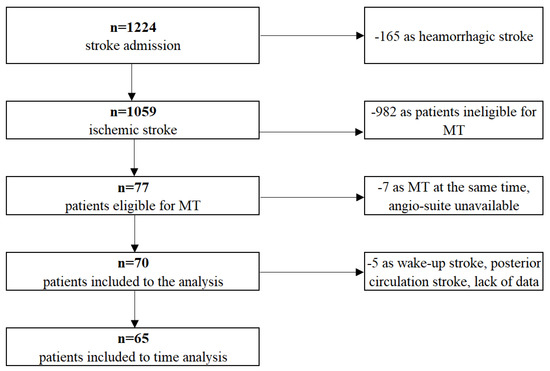 - Pawłowski, K.; Klaudel, J.; Dziadkiewicz, A.; Mączkowiak, A.; Szołkiewicz, M. Cardiac CathLab-based stroke thrombectomy routine service by the BRAIN team in a recently established Thrombectomy-Capable Stroke Center in Poland. Kardiol. Pol. 2021, 79, 684–686. [Google Scholar] [CrossRef]