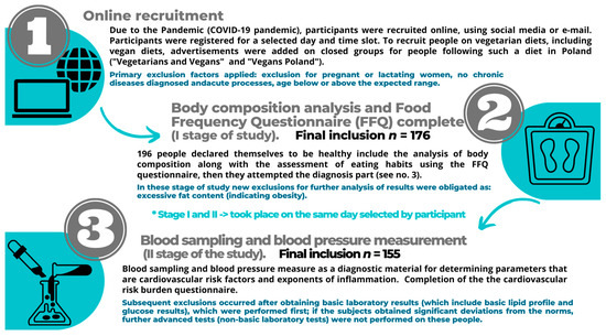 The population of this study consisted of healthy people aged 18–39, adhering to one of the following diets: (1) mixed diet/omnivores [OMN] (traditional, including meat consumption), (2) pescatarian diet [PESCA] (including the consumption of fish, eggs, and dairy products among animal products), (3) lacto-/ovo-vegetarian diet [VEGE] (eggs and dairy products including from animal products, this group includes: lacto-vegetarian, ovo-vegetarian, or lacto-ovo-vegetarian), and (4) participants on a vegan diet [vegan/-s, VEGAN] (not including meat products or products of animal origin). Using a proprietary form, the participants determined the adhering type of diet through a personal declaration. Then compliance with the FFQ questionnaire was checked (during the I stage of this study [38]). The declared dietary pattern (other than the traditional diet) should be followed for at least a year (which was an inclusion criterion). Persons entering the study were informed about the required participation in the fasting state and the factors excluding them from participation. Primary exclusion factors applied: pregnant or lactating women, chronic diseases diagnosed and acute processes, age below or above the expected range. One hundred ninety-six people declaring themselves to be healthy were recruited. They joined the study, which included the analysis of body composition along with the assessment of eating habits using the FFQ questionnaire (as the first stage of the study) and blood sampling as a diagnostic material for determining parameters that are CV factors and exponents of inflammation (as the second stage of the research). The results obtained in the first stage of the study, due to irregularities in the composition analysis (indicating obesity), showed the need to exclude 20 people (9 vegans, 7 lacto-/ovo-vegetarians, 4 pescatarians) [38]. Following exclusions occurred after obtaining primary laboratory results (which include basic lipid profile and glucose results), which were performed first; if the subjects received significant deviations from the norms or the age was above 40 (because single cases showed an age above), further analyses were not performed on these people; hence, 21 participants were excluded (5 vegans, 3 lacto-/ovo-vegetarians, 5 pescatarians, and 8 omnivores). Ultimately, 155 people participated in the study’s second stage, including non-basic determinations (a total of 41 people were excluded, and the upper age limit, due to the age criterion, was lower than in the I stage of the study; for comparison, see [38]).