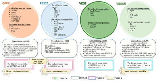 The study’s most essential results are shown schematically in Figure 4. They have been divided into four studied groups, depending on the declared diet, and the significant results have been selected and presented here.