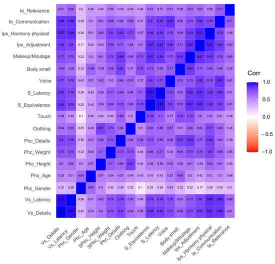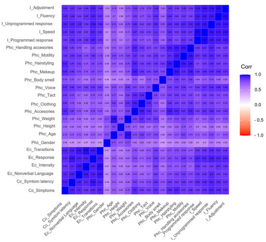 Figure 3 presents the correlation between the 11 indicators that characterize the dimension of Scenography. A strong correlation may be observed among all indicators (all > 0.8), confirmed by how homogeneously distributed the blue color is, denoting highly consistent evaluations.