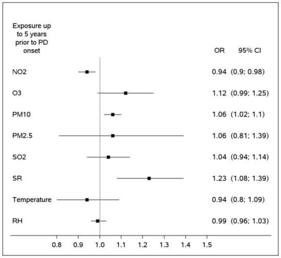 Transformed pollution and meteorological variables were further added as independent factors in a conditional logistic regression with PD as a dependent variable; clusters defined by the matched groups of cases and controls and inverse probability weights were assigned to all observations. The point estimates of association of PD with environmental factors were expressed as OR along with the 95% confidence intervals (CI) around ORs. The main effect of exposure was measured as exposure to pollutants at the 75th percentile over the span of exposure window, as compared to the median levels of pollutants. This difference in exposure (75th vs. 50th percentile) was chosen to reflect actual differences among the study participants. In addition to the three parameters used for matching, the ORs were adjusted to socioeconomic and immigration status, as well as an indicator of missing environmental levels, i.e., proportion of years with monitored pollutants’ levels out of the follow-up and the number of monitoring stations within the 20 km radius around the subject’s residence. In the main analysis we used a single-pollutant approach. Assuming interactions between environmental factors, we repeated the main analysis with a consecutive addition of temperature, relative humidity and pollutants that could potentially confound the association at study.