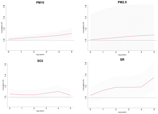 Graphical presentation of the association of Parkinson’s disease with cumulative exposure to the 75th percentile of exposure as compared to median pollutants’ levels. The red lines show the cumulative effect of a pollutant and the shaded area around the red line, represents a 95% confidence of the effect.