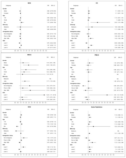 - Subjects at the lowest SES were more likely to be impacted by SO2, PM10 and PM2.5. Low socioeconomic status has been established as one of the most important risk factors for many health outcomes [42,43]. It should be noted that 12.0% of the lowest SES strata are subjects of Bedouin-Arab origin, a group that comprises just 4.3% of the study group. Approximately a quarter of the Bedouin-Arabs subjects reside in temporary tents and shacks [44] that cannot be hermetically sealed from dust storms (PM10) or anthropogenic pollution (PM2.5 and SO2) when a subject’s home is located in close proximity of a road or industrial zone. Unprotected households combined with hazardous work exposures, poor diet, and other factors characterizing a low SES stratum [43] can potentially increase the susceptibility of the population.