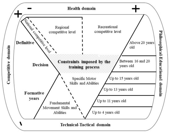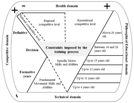 It is worth clarifying that the negative sign does not indicate the absence of stimuli in a given domain. On the contrary, the sign indicates that the domain should receive greater (+) or less (−) emphasis at a given phase, i.e., all domains must be dealt with concomitantly as the judoka formation process unfolds. There are only two domains that did not receive positive or negative signs—Technical, and Philosophical-Educational domains—since these must be addressed throughout the entire process, regardless of the competitive level or the stage of development. Finally, the proposal also includes solid and dashed lines. The dashed lines indicate that the judoka can go back and forth as often as necessary from one level to the next. For example, in some cases, the judoka needs to return to the level of development of fundamental movement skills (FMS) and only later practice with Judo-specific motor skills. Please note that this can also occur between the three levels of competition considered in the approach: national, regional, and recreational. The solid lines that close the model at the national and regional levels indicate that at a given moment, for different reasons (e.g., physical, motivational), the judoka ended his/her competitive career. The recreational level does not have lines at the top because, at this non-competitive level, the Health domain is predominant, and the judoka does not have any need or obligation to compete.