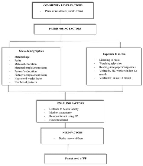 For this study, the exposure variables were selected based on previous studies from LMICs [,,,,] and availability in the DHS data. The study factors were broadly classified as community-level, predisposing, enabling, and need factors based on the Anderson conceptual model of health service utilization and health-seeking behaviors []. The adopted conceptual model was consistent with past studies that examined the relationship between study factors and the unmet need for FP among married women [,,,,,].