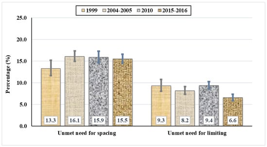 From 1999 to 2016, the unmet need for birth spacing among married women increased from 13.3% (95% confidence interval [CI]: 11.6%, 15.2%) in 1999 to 15.5% (95% CI: 14.5%, 16.6%) in 2016, with fluctuations between 2004/05 and 2010, with findings of 16.1% (95% CI: 14.9%, 17.3%) in 2004/05 and 15.9% (95% CI: 14.6%, 17.3%) in 2010. In contrast, the proportion of women with an unmet need for limiting births decreased from 9.3% (95% CI: 7.9%, 10.6%) in 1999 to 6.6% (95% CI: 5.9%, 7.3%) in 2016, with fluctuations in 2004/05 and 2010, with findings of 8.2% (95% CI: 7.5%, 9.1%) in 2004/05 and 9.4% (95% CI: 8.6%, 10.3%) in 2010 (Figure 2).