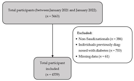 In our cross-sectional survey-based study, conducted in Saudi Arabia between January 2021 and January 2022, we recruited participants using snowballing sampling. The target population was invited to participate by accessing a web link to the survey via ads on social media platforms. To be included in the study, participants had to be between 18 and 74 years old at the time of the survey, be a Saudi national, and be able to read Arabic fluently. All participants diagnosed with diabetes at the time of the survey were excluded from the sample.