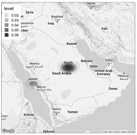 In future research conducted to inform public health decision-makers in Saudi Arabia, using a different geospatial mapping technique with Global Positioning System (GPS) data and a mobile application could yield more granular data about the exact location (i.e., within 1 km) of participants [33]. If applied appropriately, then the approach may be used to study interesting patterns within a city, including associations between the presence of health facilities, served and underserved populations, zip codes, green spaces, parks, and other important variables [34,35].