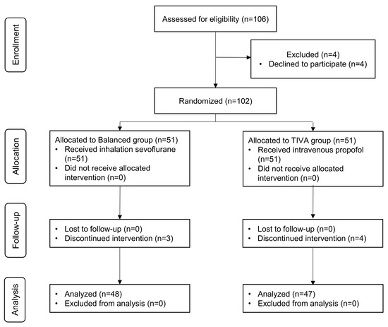 19. Niu, Z.; Gao, X.; Shi, Z.; Liu, T.; Wang, M.; Guo, L.; Qi, D. Effect of total intravenous anesthesia or inhalation anesthesia on postoperative quality of recovery in patients undergoing total laparoscopic hysterectomy: A randomized controlled trial. J. Clin. Anesth. 2021, 73, 110374. [Google Scholar] [CrossRef]