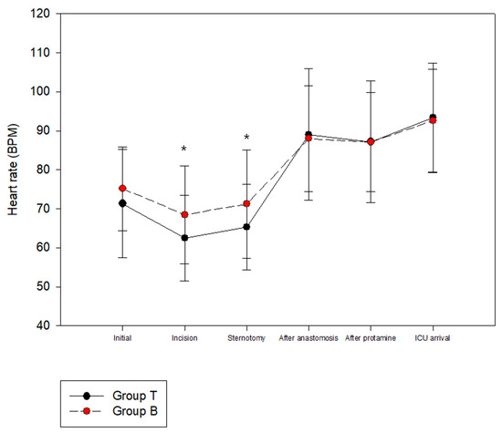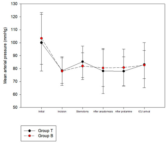 The HR was significantly lower in Group T than Group B at the time of skin incision and sternotomy (Figure 2). The MAP was not significantly different between the two groups (Figure 3). There were no significant differences between Groups B and T in terms of the length of ICU stay (26.56 ± 13.80 vs. 22.79 ± 8.40 h, p = 0.112) or length of hospital stay (13.79 ± 4.59 vs. 12.57 ± 3.33 days, p = 0.143). There were no serious complications, including death, after surgery in either group.