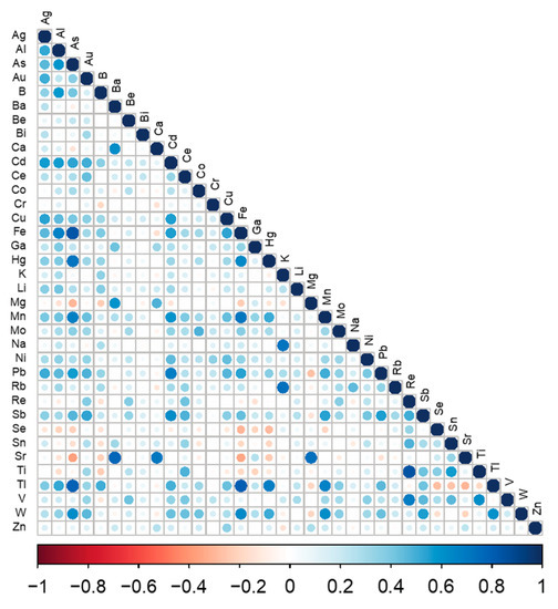 Correlation matrix of the 36 chemical elements concentrations measured in the hair of study participants. Color and size variation of circles in the figure are proportional level and direction (positive or negative) of the correlation between elements.