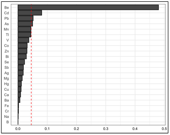 The chemical elements with significant weights in the toxic mixture that were present consistently in all models were Be, Cd, Pb, and As. Be was the strongest contributor of the WQS index in all models. In model 2, the mean weights of single elements to the WQS index were for Be (0.48), Cd (0.08), P (0.05), As (0.05), and Mn (0.045) (Figure 2).