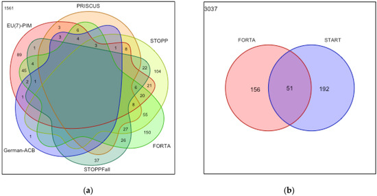 - Krüger, C.; Schäfer, I.; van den Bussche, H.; Bickel, H.; Dreischulte, T.; Fuchs, A.; König, H.-H.; Maier, W.; Mergenthal, K.; Riedel-Heller, S.G.; et al. Comparison of FORTA, PRISCUS and EU(7)-PIM lists on identifying potentially inappropriate medication and its impact on cognitive function in multimorbid elderly German people in primary care: A multicentre observational study. BMJ Open 2021, 11, e050344. [Google Scholar] [CrossRef]