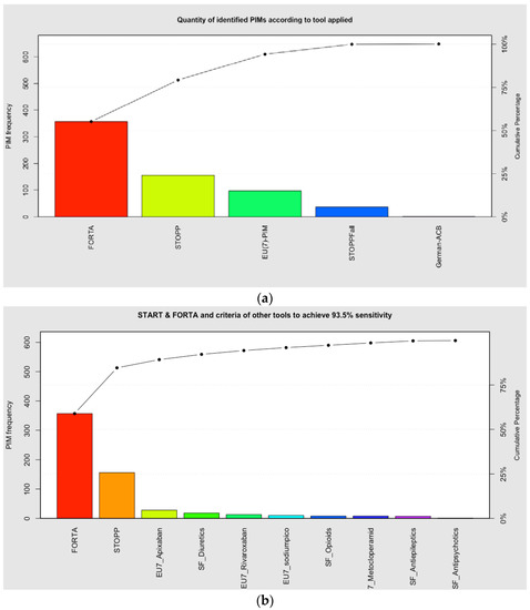 The Pareto chart in Figure 2a shows (as bars) the percentage of all PIMs detected by FORTA-C/D, while the remaining bars show the percentage of new PIMs additionally detected by each tool, after application of the previous tool(s). The line shows the cumulative sensitivity (i.e., the percentage of PIMs detected) resulting from the addition of each tool. Since PRISCUS did not identify any PIMs exclusively, this tool was not considered in this analysis. Starting with FORTA C/D (which had the highest sensitivity, of 55.1%), adding STOPP achieves a cumulative sensitivity of 79.2%, and further adding EU(7)-PIM achieves a sensitivity of 94.1%. Figure 2b shows that after application of FORTA-C/D and STOPP, adding PIM criteria for four drugs (apixaban, rivaroxaban, and sodium picosulfate from the EU(7)-PIM list; diuretics from STOPPFall) increases the sensitivity by 10.6% to 89.8%. The addition of criteria relating to opioids, antiepileptics and antipsychotics (from STOPPFall), and metoclopramide (from EU(7)-PIM), increases the sensitivity further by 3.7% to 93.5%.