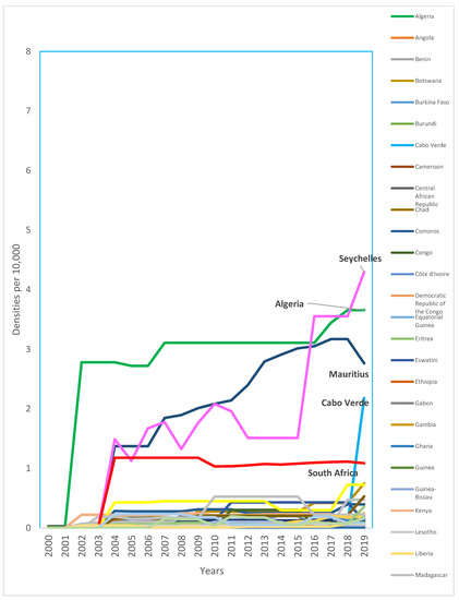 Trends in density of dentists per 10,000 population for the AFR, 2000-2019 (Appendix D). Source: The workforce data are based on the latest available data in the NHWA data platform as of 31 March 2021, apart from the data for 2019, which used a combination of the latest available data from the NHWA data platform and King’s College London survey. Countries with the highest densities were named in the plot and highlighted in bold.