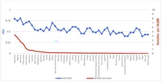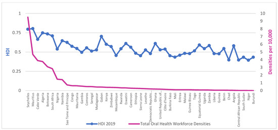 Densities of dentists per 10,000 population and Human Development Index (HDI) for the AFR, 2019. Source: The workforce data are based on a combination of the latest available data from the NHWA data platform and King’s College London survey. HDI was collected from the latest Human Development Report from the United Nations Development Programme (UNDP).