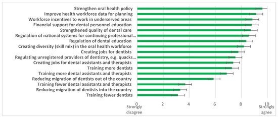 Comparable themes were displayed by 17 countries in highlighting additional solutions. Stronger governance was advocated to support action towards an appropriate OHWF, including “defining clearly, the roles and responsibilities of the dental auxiliaries” was advocated. Workforce redistribution required action, recognising that “dentists and other oral health professionals congregate in cities leaving remote areas underserved” were highlighted. To deliver this change, there was a great need identified by some countries to establish, extend, or re-establish dental education and training, including “creating a dental school in the country, training existing staff, continuing training, implementing specialties”, “re-opening training schools”, and enabling “inclusion of essential oral health care services as part of UHC initiatives.” Additional factors included enriching the system through “exchanges with other countries”, “developing postgraduate training”, and undertaking “planning and operational research”.