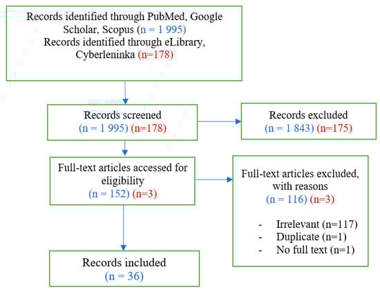 PRISMA flow diagram. The red code indicates the English scientific databases; the blue code indicates the Russian databases.