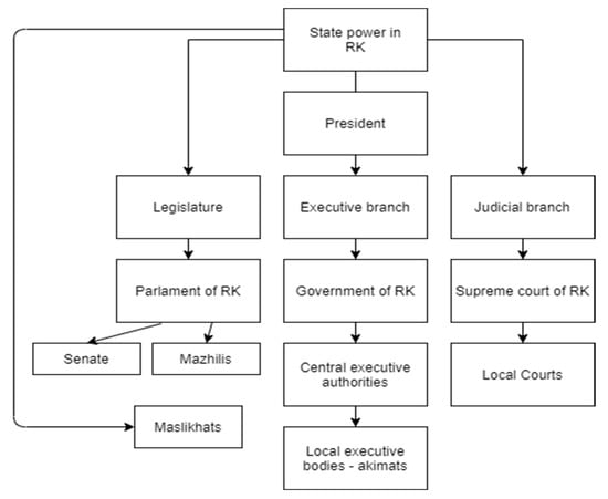 The RK is a unitary state with a presidential form of government. The main political directions in the development of the state, including in the field of healthcare, are determined by the president through the Annual Messages to the people of RK, the approval of the strategy and strategic plan for the development of RK, and state programs for the development of the sectoral and intersectoral levels. The development of the main directions of state policy in the field of healthcare is carried out by the government, which approves the state program for the development of healthcare. The Ministry of Health (hereinafter the MH) implements the state health policy [].
