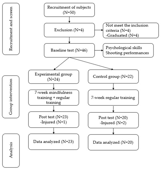 Since the intervention was group-based, 23 athletes from the same university basketball team were assigned to the experimental group and received the mindfulness intervention in addition to one of the regular daily basketball practices, while 20 athletes from another university basketball team were assigned to the control group and only engaged in regular daily basketball training without mindfulness or psychological practice. For the convenience of intervention implementation, the mindfulness training intervention program was primarily administered in the university basketball training court and classroom by the researchers who have been trained as instructors of the mindfulness program. The details of the research flow chart are presented in Figure 1.