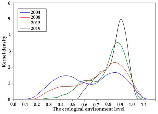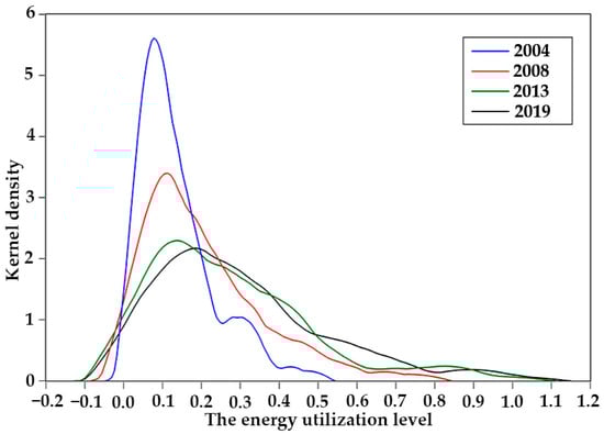 Four typical years (2004, 2008, 2013, and 2019) were selected to produce a kernel diagram of the three major systems of energy utilization, economic growth, and the ecological environment, using kernel density estimation.