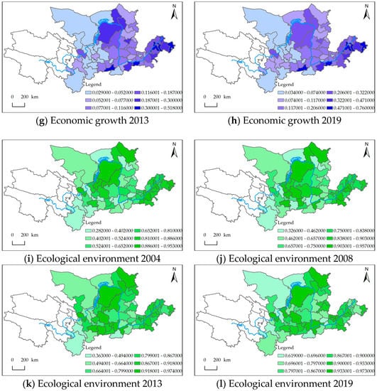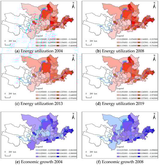 The spatial distributions of the energy utilization, economic growth, and ecological environment systems were obtained for the four typical years of 2004, 2008, 2013, and 2019 (Figure 5). The overall development trend of energy utilization was good, and the level of energy utilization in various regions improved, but regional differences remained. In the early years, the energy utilization status of regional central cities and coastal cities was good. After that, the energy utilization level in areas with rich resources and a good industrial foundation significantly improved. More recently, the overall energy utilization situation in the various regions was good, but some regions still had a low level of energy utilization. As with economic growth, the overall situations of the cities showed an upward trend, but there were some regional differences. In the early stage, the downstream coastal cities and some regional central cities with a good industrial foundation in the midstream regions showed rapid economic development momentum and obvious economic growth. After that, the cities with geographical advantages and rich resources in the midstream and upstream regions also gradually improved. More recently, the economic development in the downstream region was still the best. As with the ecological environment, the overall development trend was also good. The level of the ecological environment improved over the years, and the regional gap was significantly narrowed. In the early stage, the ecological environment level of the “Ji-characters” region of the Yellow River basin and the downstream region was relatively better than that of the other regions. Later, the ecological environment levels in the midstream and downstream regions were better than those in the upstream regions. More recently, the level of the ecological environment rapidly improved.
