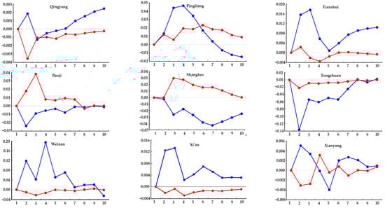 As shown in Figure 7, for the midstream regions, the impact of economic growth and energy utilization on the ecological environment was roughly the same on the whole region. The impact effect was relatively obvious in the initial and medium stages. Compared with the downstream and upstream regions, economic growth and energy utilization in the midstream regions had less impact on the ecological environment. The impact of economic growth and energy utilization on the ecological environment in Xianyang, Datong, Lvliang, Taiyuan, and other places was symmetrically distributed. There was a simultaneous impact of economic growth and energy utilization on the ecological environment, but the impact was gradually reduced. In the cities of Sanmenxia, Linfen, and other places, a negative response to the impact of energy utilization was observed in the initial stage, while a positive response to the impact of economic growth was obtained. As time went on, their impact on the ecological environment tended to be stable. Baoji and Yan’an showed a positive response to the impact of energy utilization in the initial stage and a negative response to the impact of economic growth. As time went on, their impact on the ecological environment tended to become stable. The impact of economic growth on the ecological environment in the cities of Xi’an, Shuozhou, and Weinan was higher than the impact of energy utilization on the ecological environment. As time went on, the impact of the two factors on the ecological environment gradually decreased and tended to become stable.
