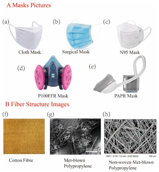Mask pictures and fiber structure images [17,37,38]: (A) represents the mask pictures, including cloth masks, surgical masks, N95 masks, P100FFR masks, and PAPR masks; (B) shows the fiber structure images and cotton fiber, melt-blown polypropylene, and non-woven melt-blown polypropylene materials that are used in masks.