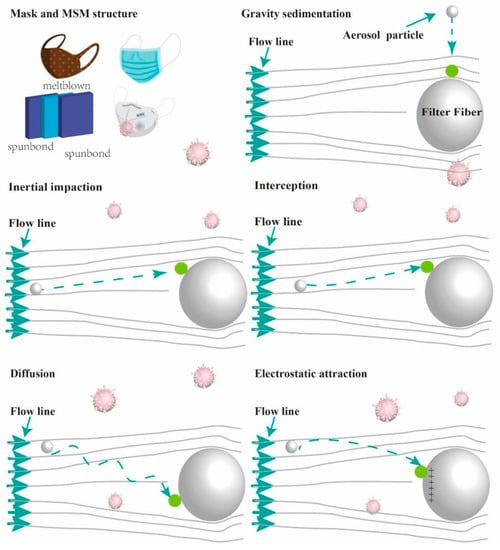 In order to study the factors affecting the filtration performance of masks and the recognition of relationships between factors and performance, it is necessary to understand the basic transmission mechanisms between aerosols and masks and the classification of masks to gain a clearer understanding. The mechanism of virus particles passing through fabric is divided into gravity sedimentation, inertial collision, interception, diffusion, and electrostatic interaction [34,35,36]. Section 2.1 discusses the types and characteristics of masks. The filtration mechanisms regarding the interaction between aerosols and masks are discussed in Section 2.2.