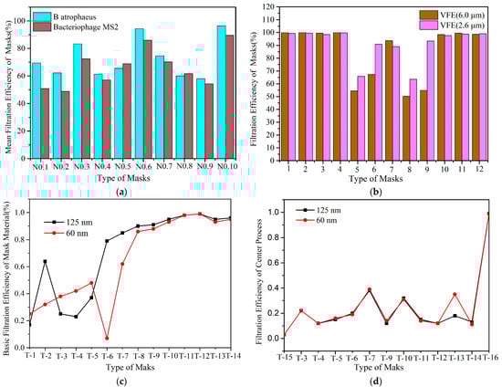 Effects of aerosol particle size and type on filtration efficiency: (a) Comparison of filtration efficiency between surgical masks and 9 types of fabric mask. N0.1–N0.10 represent 100% cotton, scarf, tea towel, pillowcase, antimicrobial pillowcase, vacuum cleaner bag, cotton mix, linen, silk, and surgical mask; these categories of masks are derived from those defined in the literature [86]. (b) The filtration efficiencies of 6 different types of fabrics were compared for 2 aerosol sizes, 6.0 μm and 2.6 μm, respectively. Numbers 1–12 represent the N95, surgical 1, surgical 2, disposable 1, fabric 1, fabric 2, fabric 3, fabric 4, fabric 5, fabric 5+dw, fabric 5+vb, and fabric 6; the categories of masks are derived from those defined in the literature [101]. (c) Basic filtration efficiency of mask material [87]. (d) The filtration efficiency with insertion of a layer into a 2-layer cotton mask. T-1–T-16 represents cotton 1 layer, dust mask, #4 coffee filter, cotton 1 layer, shop towel, filtrate 1500, surgical warp, N95 1 layer, medical mask, shop vac, KN95, N95 2 layers, 3M-8511, FTR467 ULPA, dusk mask, and sealed KN95 [87].