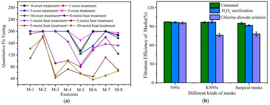 Fitness and decontamination research on filtration efficiency: (a) quantitative fit testing results for the new N95 respirator and after oven and steam heat-treatment cycles; M-1-M-8 represent normal breathing, deep breathing, head side to side, head up and down, talking, bending over, normal breathing, and overall fit factor, respectively [103]; (b) filter efficiency of mask after hydrogen peroxide and chlorine dioxide decontamination [102].