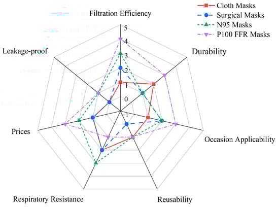 The protective properties of masks vary according to the type of mask. The filtration efficiency, durability, occasion applicability, reusability, respiratory resistance, prices, and leakage-proof abilities of different types of masks are summarized in Figure 5.