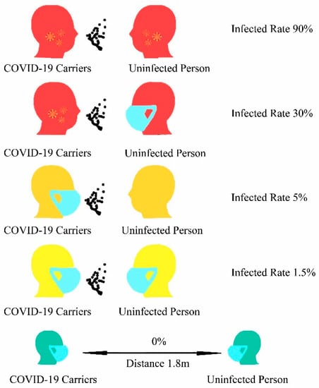 In summary, wearing a mask can keep us safe from COVID-19 when in contact with COVID-19 carriers in a dangerous environment (Figure 6). The particle filtration efficiency of N95 masks was more than 95% with NaCl particle sizes of 0.3 mm. However, for real 10–80 nm viruses, the filtration efficiency is not ideal at high suction flow rates, and the filtration efficiency is less than 95% (for 50 nm viruses) [106,107]. The size of particles absorbed by the virus varies according to the mode of transmission. COVID-19 virus airborne aerosol particles are smaller than 5 μm, and respiratory fluid droplets are between 10 and 5 µm [139], and aerodynamic sizes of 800 nm or greater have been reported for airborne bacteria [109]. Because P100 FFR and PARR masks are more efficient at filtering, N95, P100 FFR, and PARR masks could, therefore, protect wearers from particles of 300 nm and above, which is enough to filter out COVID-19. The filtration efficiency of surgical masks should not be less than 95% when the unnaturalized latex pellet aerosol particle size is 100 nm and the gas flow rate is 28.3 L/min [110]. Consequently, surgical masks and N95, P100 FFR, and PARR masks can protect people from COVID-19.