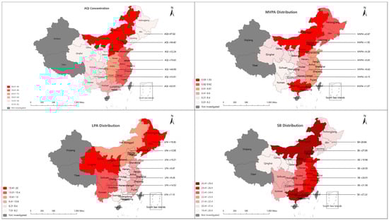 A contribution of Figure 1 is that it covers the most urban and rural cities of 30 provinces in mainland China, while its limitation is that we used the average data from the samples to represent those of all seven administrative regions. The present results given here can be used to establish a national context for studies of individual rural and urban areas. Based on their spatial distributions, the times spent engaged in LPA in Northeast China (Heilongjiang, Jilin, and Liaoning provinces) and Northwest China (Shannxi, Ningxia, and Gansu provinces) were higher than those in the other areas. One possible reason for this is that the aging population rate in most of these provinces is high (ranking at 18.7% in the country), even higher than that in other provinces. Further, adults aged 60 or older accounted for 20% of the residents in Heilongjiang, Jilin, and Liaoning provinces in 2020. The highest average time spent engaged in SB was in North China (Beijing–Tianjin–Hebei Region, Inner Mongolia, and Shanxi) and in South China (Guangdong and Guangxi), followed by other coastal areas in Eastern China. This may be due to more professional older adults being re-employed following retirement and returning to a five-day work pattern. Moreover, the time spent engaged in MVPA was high in North China and the south China coast. One possible reason for this higher time spent engaged in MVPA is the relatively developed sports industry and the higher Sports Livelihood Happiness Index in Beijing and the coastal areas []. These coastal areas are among the top 10 economically powerful provinces in China, and the economic development may be a vital parameter in public service for national fitness in terms of facilities and urban development. However, the inequalities in the average AQI concentration and MVPA, LPA, and SB distributions in these seven administrative regions highlight the need for future work to be carried out in order to explore the reasons.