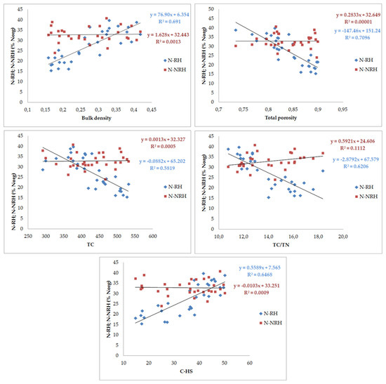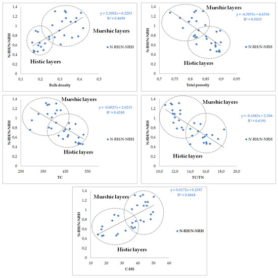 Of the hydrolyzable nitrogen forms, a higher variability of their shares was found for the fraction extracted using 0.25 M H2SO4, which is operationally called ‘readily hydrolyzable’ (N-RH). The examined genetic horizons may be ranked in the following increasing order of the share of this fraction in Norg: peat (hemic) < peat (sapric) < murshic layers. Coefficients of correlation with soil properties indicate that accumulation of this nitrogen fraction is significantly caused by an aerobic transformation of organic matter in murshic soil and processes of peat formation decomposition—significant positive correlations (high coefficient values) with organic soil properties which varied in the way which is typical of secondary transformation and organic matter decomposition, in particular a positive relationship with C-HS and N-HS and a negative relationship with the TC/TN ratio. Selected relationships are presented together graphically with the non-readily hydrolyzable fraction which had lower variability and no close associations with soil properties (excluding a negative correlation with TN) (Figure 1).