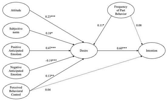 In addition, the participants’ behavioral intentions were strongly associated with desire (β = 0.60, p < 0.001) but not directly related to PBC and FPB, thus supporting H9 but rejecting H7 and H8. Overall, the current study suggests a full-mediatory role of behavioral desires in the relationship between the MGB determinants and intentions in this study’s context.