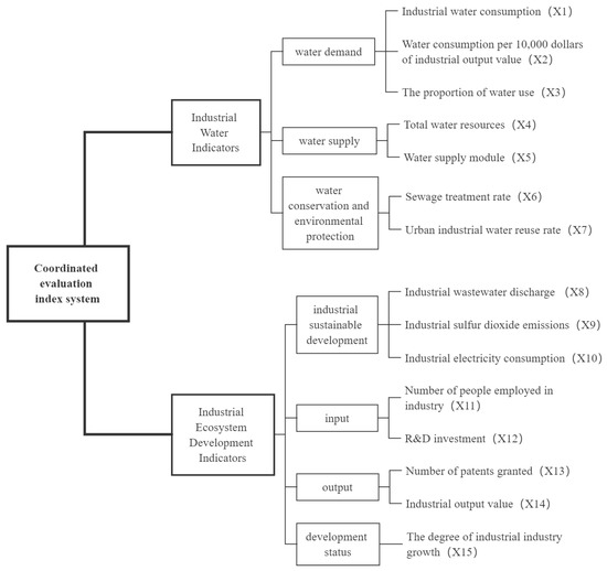 The evaluation index is one of the indispensable elements in the process of systematic evaluation, and the rationality of its selection is directly related to the accuracy of evaluation results. The principles of scientific nature, comparability, representativeness, and systematization should be considered in establishing a coordinated evaluation index system. Considering that industrial water resource utilization has a prominent contradiction between supply and demand and serious water pollution, we have selected seven evaluation indicators to evaluate water use from three aspects of water demand, supply and conservation, and environmental protection. The basis of industrial development is the need for a certain amount of human, material, and financial input, and industrial output is the basis for measuring industrial development. In addition, the green and sustainable development of industry also needs to be considered. Therefore, we selected eight evaluation indicators to evaluate the development of the industrial ecosystem from the four aspects of industrial sustainable development, input, output, and development status. Regarding the nature of the indicators, except for the six indicators under industrial water demand and sustainable development, which are negative indicators, the rest of the indicators are positive indicators. The specific evaluation index system is shown in Figure 1.