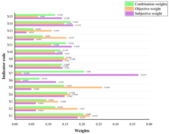 In this paper, the subjective and objective weights of the evaluation indicators are obtained by using the AHP subjective weighting and the objective weighting method of the coefficient of variation method. The combination weighting method based on game theory is used to obtain the final weights. The subjective and objective weights and combination weights of the evaluation indicators are shown in Figure 3.